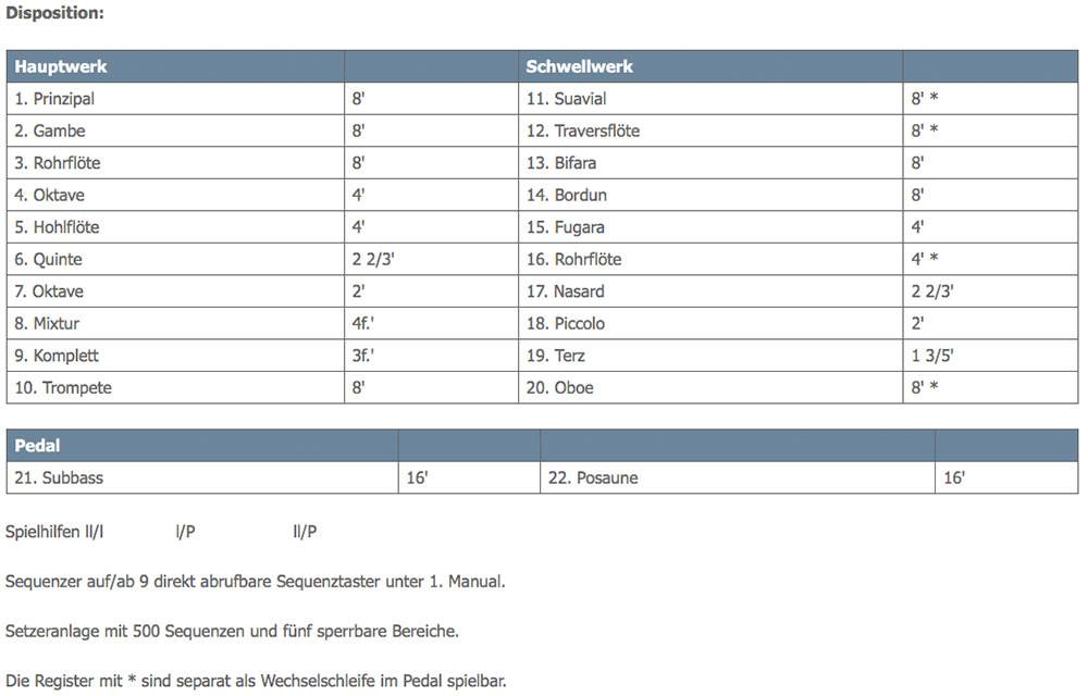 Mit der Trompete 8', einem sog. Zungenregister, steht ein viertes 8-füßiges Register mit stark schmetterndem Klang in Tenorlage auf dem ersten Manual zur Verfügung.