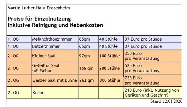Im Martin Luther Haus stehen mehrere Räume und ein Saal mit Bühne und ein kleiner Saal zur Nutzung zur Verfügung. Sie können diese Räume für Veranstaltungen und private Feiern mieten.